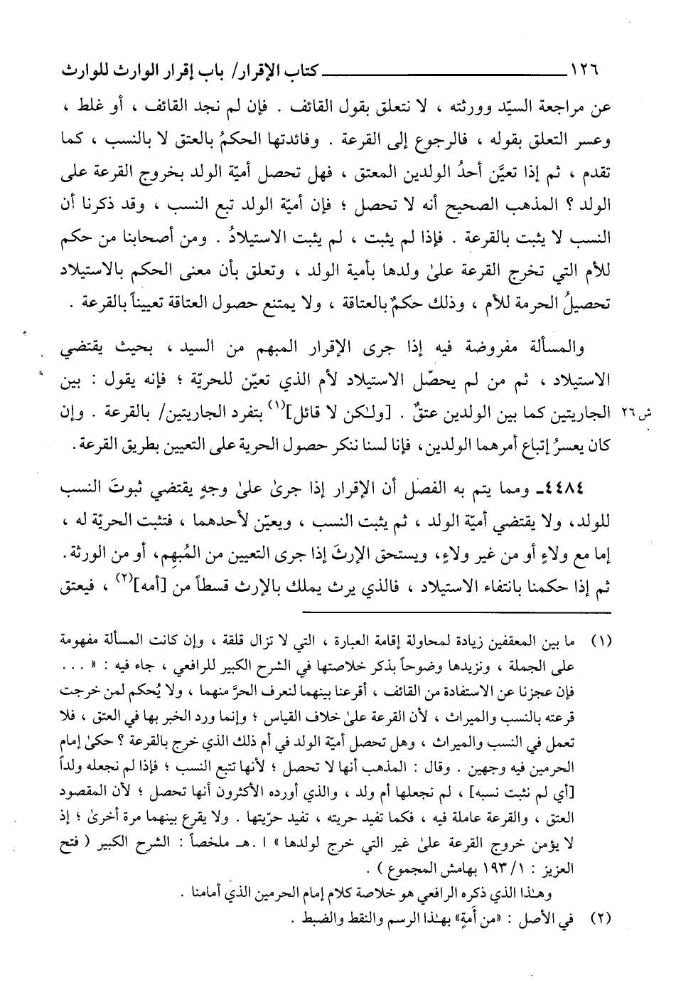 (1) ما بين المعقفين زيادة لمحاولة إقامة العبارة، التي لا تزال قلقة، وإن كانت المسألة مفهومة على الجملة، ونزيدها وضوحاً بذكر خلاصتها في الشرح الكبير للرافعي، جاء فيه: " ... فإن عجزنا عن الاستفادة من القائف، أقرعنا بينهما لنعرف الحرَّ منهما، ولا يُحكم لمن خرجت قرعته بالنسب والميراث، لأن القرعة على خلاف القياس؛ وإنما ورد الخبر بها في العتق، فلا تعمل في النسب والميراث، وهل تحصل أمِّة الولد في أم ذلك الذي خرج بالقرعة؟ حكى إمام الحرمين فيه وجهين. وقال: المذهب أنها لا تحصل؛ لأنها تتبع النسب؛ فإذا لم نجعله ولداً [أي لم نثبت نسبه]، لم نجعلها أم ولد، والذي أورده الاكثرون أنها تحصل؛ لأن المقصود العتق، والقرعة عاملة فيه، فكما تفيد حريته، تفيد حرّيتها. ولا يقرع بينهما مرة أخرى؛ إذ لا يؤمن خروج القرعة على غير التي خرج لولدها" ا. هـ ملخصاً: الشرح الكبير (فتح العزيز: 1/ 193 بهامش المجموع).