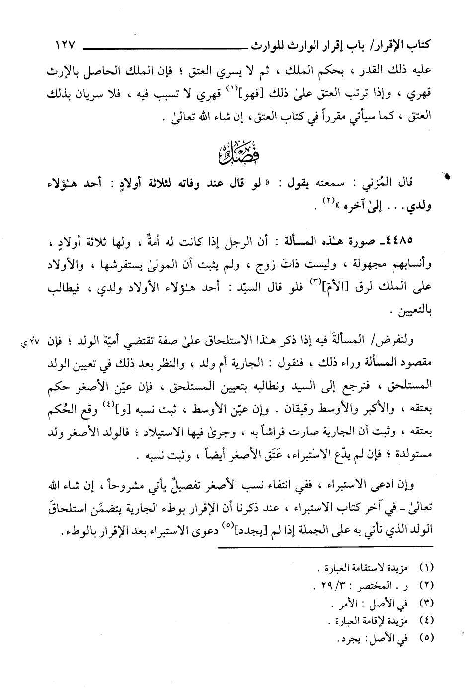 4485 - صورة هذه المسألة: أن الرجل إذا كانت له أمةٌ، ولها ثلاثة أولادٍ، وأنسابهم مجهولة، وليست ذاتَ زوج، ولم يثبت أن المولى يستفرشها، والأولاد على الملك لرق [الأمّ] (3) فلو قال السيّد: أحد هؤلاء الأولاد ولدي، فيطالب بالتعيين.