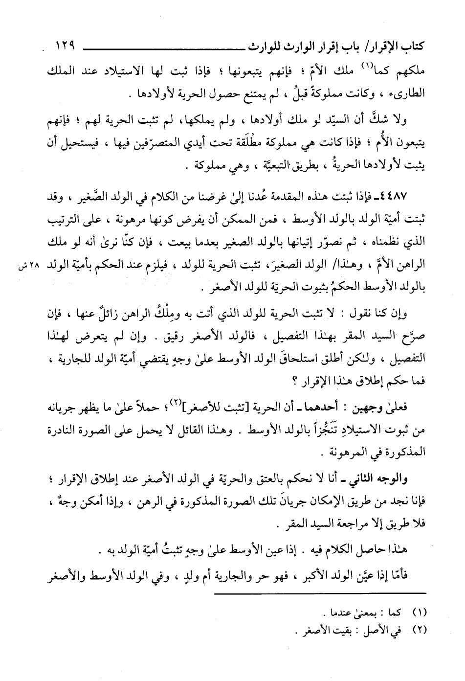 4487 - فإذا ثبتت هذه المقدمة عُدنا إلى غرضنا من الكلام في الولد الصَّغير، وقد ثبتت أميّة الولد بالولد الأوسط، فمن الممكن أن يفرض كونها مرهونة، على الترتيب الذي نظمناه، ثم نصوّر إتيانها بالولد الصغير بعدما بيعت، فإن كنّا نرى أنه لو ملك الراهن الأمَّ، وهذا الولد الصغيرَ، تثبت الحرية للولد، فيلزم عند الحكم بأميّة الولد بالولد الأوسط الحكمُ بثبوت الحريّة للولد الأصغر.