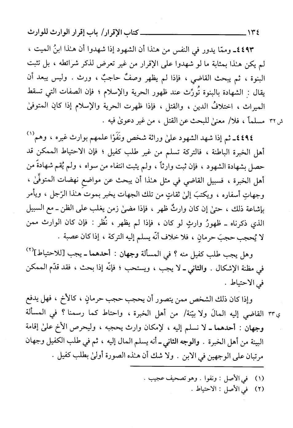 4493 - وممّا يدور في النفس من هذا أن الشهود إذا شهدوا أن هذا ابنُ الميت، لم يكن هذا بمثابة ما لو شهدوا على الإقرار من غير تعرض لذكر شرائطه، بل تثبت البنوة، ثم يبحث القاضي، فإذا لم يظهر وصفٌ حاجبٌ، ورث. وليس يبعد أن يقال: الشهادة بالبنوة تُورِّث عند ظهور الحرية والإسلام؛ فإن الصفات التي تسقط الميراث، اختلافُ الدين، والقتل، فإذا ظهرت الحرية والإسلام إذا كان المتوفى مسلماً، فلا معنى للبحث عن القتل، من غير دعوى فيه.