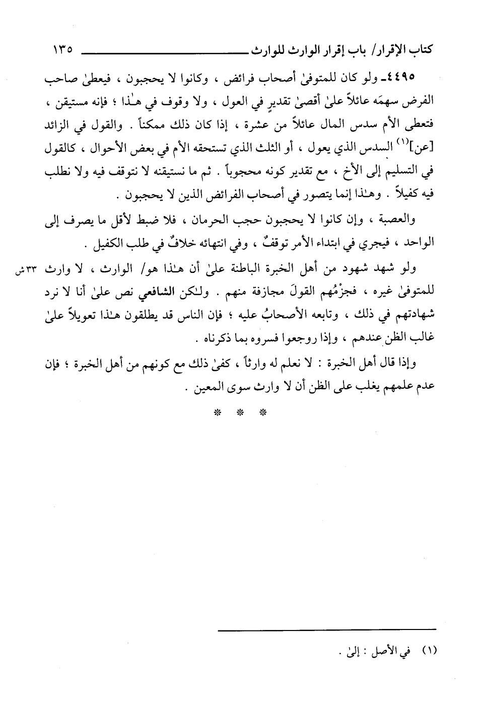 4495 - ولو كان للمتوفى أصحاب فرائض، وكانوا لا يحجبون، فيعطى صاحب الفرض سهمَه عائلاً على أقصى تقديرٍ في العول، ولا وقوف في هذا؛ فإنه مستيقن، فتعطى الأم سدس المال عائلاً من عشرة، إذا كان ذلك ممكناً. والقول في الزائد [عن] (1) السدس الذي يعول، أو الثلث الذي تستحقه الأم في بعض الأحوال، كالقول في التسليم إلى الأخ، مع تقدير كونه محجوباً. ثم ما نستيقنه لا نتوقف فيه ولا نطلب فيه كفيلاً. وهذا إنما يتصور في أصحاب الفرائض الذين لا يحجبون.