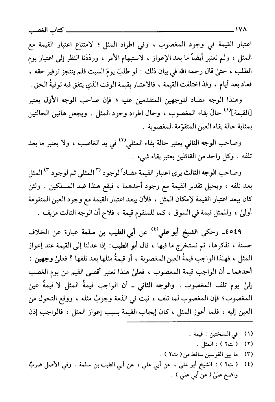 4549 - وحكى الشيخ أبو علي (4) عن أبي الطيب بن سلمة عبارة عن الخلاف حسنة، نذكرها، ثم نستخرج ما فيها، قال أبو الطيب: إذا عدلنا إلى القيمة عند إعواز المثل، فهذا الواجب قيمةُ العين المغصوبة، أو قيمةُ مثلها بعد تلفها؟ فعلى وجهين: أحدهما - أن الواجب قيمة المغصوب، فعلى هذا نعتبر أقصى القيم من يوم الغصب إلى يوم تلف المغصوب. والوجه الثاني - أن الواجب قيمةُ المثل لا قيمةُ عين المغصوب؛ فإن المغصوب لما تلف، ثبت في الذمة وجوبُ مثله، ووقع التحول من العين إليه، فلما أعوز المثل، كان إيجاب القيمة بسبب إعواز المثل، فالواجب إذن