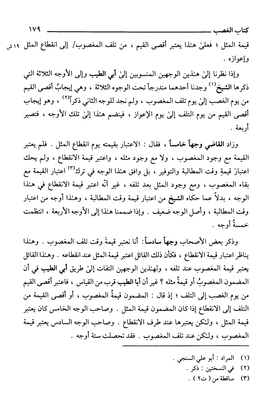 وإذا نظرنا إلى هذين الوجهين المنسوبين إلى أبي الطيب وإلى الأوجه الثلاثة التي ذكرها الشيخ (1) وجدنا أحدهما مندرجاً تحت الوجوه الثلاثة، وهي إيجابُ أقصى القيم من يوم الغصب إلى يوم تلف المغصوب، ولم نجد للوجه الثاني ذكراً (2)، وهو إيجاب أقصى القيم من يوم التلف إلى يوم الإعواز، فينضم هذا إلى تلك الأوجه، فتصير أربعة.
