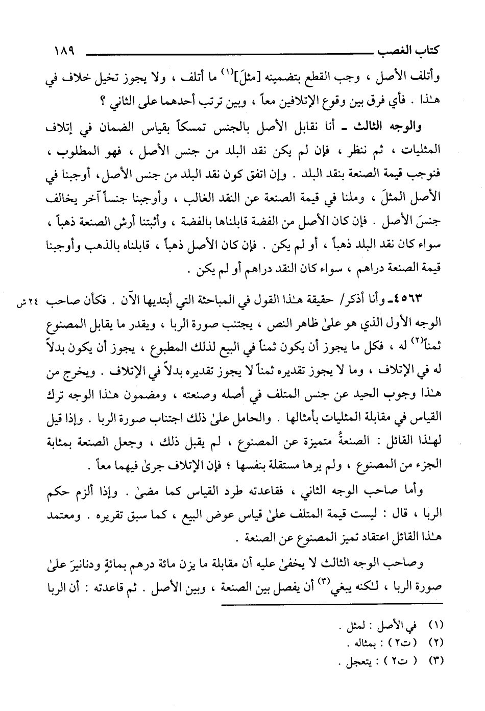 4563 - وأنا أذكر حقيقة هذا القول في المباحثة التي أبتديها الآن. فكأن صاحب الوجه الأول الذي هو على ظاهر النص، يجتنب صورة الربا، ويقدر ما يقابل المصنوع ثمناً (2) له، فكل ما يجوز أن يكون ثمناً في البيع لذلك المطبوع، يجوز أن يكون بدلاً له في الإتلاف، وما لا يجوز تقديره ثمناً لا يجوز تقديره بدلاً في الإتلاف. ويخرج من هذا وجوب الحيد عن جنس المتلف في أصله وصنعته، ومضمون هذا الوجه ترك القياس في مقابلة المثليات بأمثالها. والحامل على ذلك اجتناب صورة الربا. وإذا قيل لهذا القائل: الصنعةُ متميزة عن المصنوع، لم يقبل ذلك، وجعل الصنعة بمثابة الجزء من المصنوع، ولم يرها مستقلة بنفسها؛ فإن الإتلاف جرى فيهما معاً.