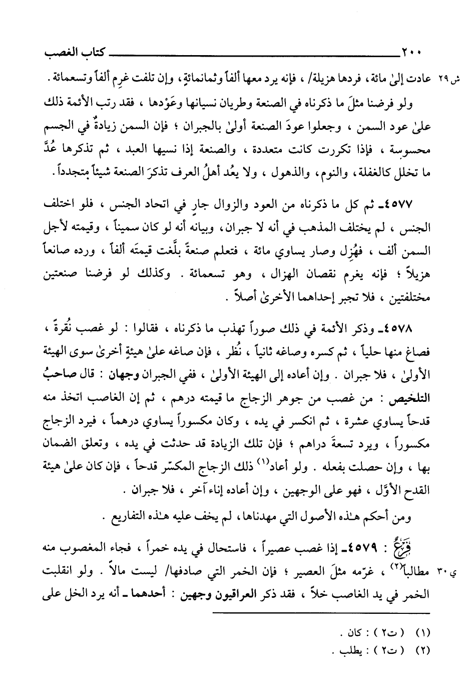 4578 - وذكر الأئمة في ذلك صوراً تهذب ما ذكرناه، فقالوا: لو غصب نُقرةً، فصاغ منها حلياً، ثم كسره وصاغه ثانياً، نُظر، فإن صاغه على هيئةٍ أخرى سوى الهيئة الأولى، فلا جبران. وإن أعاده إلى الهيئة الأولى، ففي الجبران وجهان: قال صاحبُ التلخيص: من غصب من جوهر الزجاج ما قيمته درهم، ثم إن الغاصب اتخذ منه قدحاً يساوي عشرة، ثم انكسر في يده، وكان مكسوراً يساوي درهماً، فيرد الزجاج مكسوراً، ويرد تسعةَ دراهم؛ فإن تلك الزيادة قد حدثت في يده، وتعلق الضمان بها، وإن حصلت بفعله. ولو أعاد (1) ذلك الزجاج المكسّر قدحاً، فإن كان على هيئة القدح الأوَّل، فهو على الوجهين، وإن أعاده إناء آخر، فلا جبران.