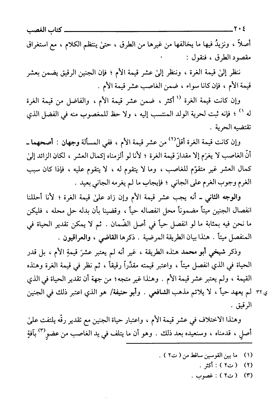 وهذا الاختلاف في عشر قيمة الأم، واعتبار حياة الجنين مع تقدير رقّه يلتفت على أصلٍ، قدمناه، وسنعيده بعد ذلك. وهو أن ما يتلف في يد الغاصب من عضوِ (3) بآفةٍ