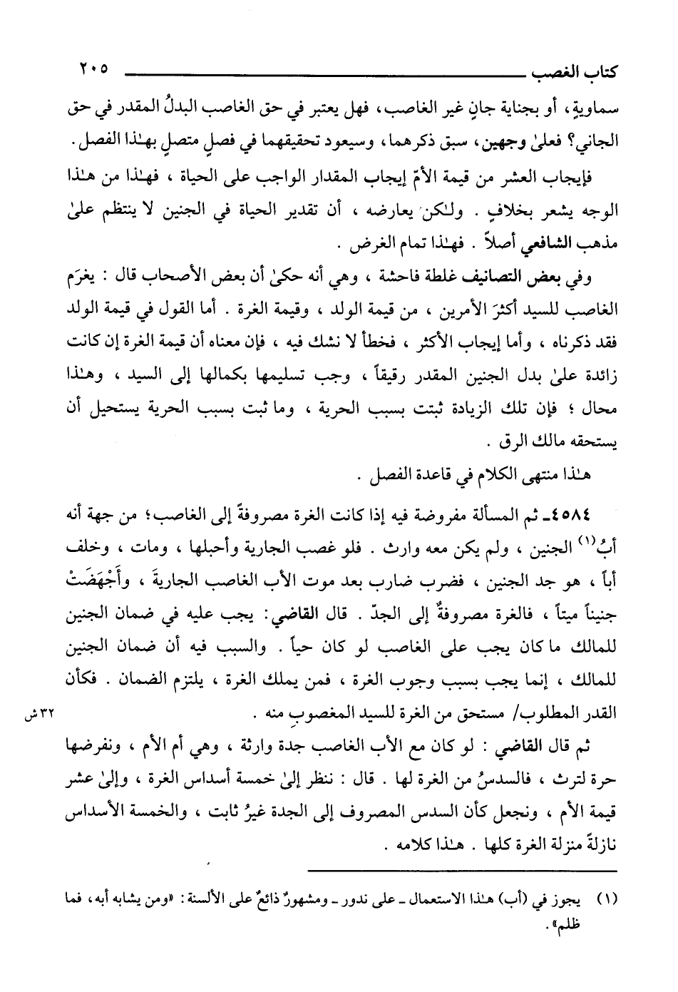4584 - ثم المسألة مفروضة فيه إذا كانت الغرة مصروفةً إلى الغاصب؛ من جهة أنه أبُ (1) الجنين، ولم يكن معه وارث. فلو غصب الجارية وأحبلها، ومات، وخلف أباً، هو جد الجنين، فضرب ضارب بعد موت الأب الغاصب الجاريةَ، وأَجْهَضَتْ جنيناً ميتاً، فالغرة مصروفةٌ إلى الجدّ. قال القاضي: يجب عليه في ضمان الجنين للمالك ما كان يجب على الغاصب لو كان حياً. والسبب فيه أن ضمان الجنين للمالك، إنما يجب بسبب وجوب الغرة، فمن يملك الغرة، يلتزم الضمان. فكأن القدر المطلوب مستحق من الغرة للسيد المغصوبِ منه.