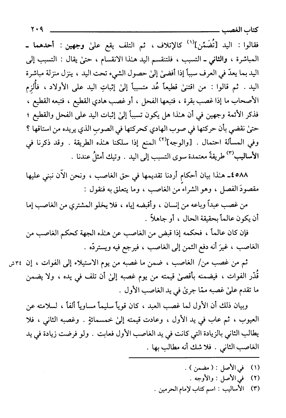 فقالوا: اليد [تُضَمِّن] (1) كالإتلاف، ثم التلف يقع على وجهين: أحدهما - المباشرة، والثاني - التسبب، فلتنقسم اليد هذا الانقسام، حتى يقال: التسبب إلى اليد بما يعدّ في العرف سبباً إذا أفضى إلى حصول الشيء تحت اليد، ينزل منزلة مباشرة اليد. ثم قالوا: من اقتنى قطيعاً عُد متسبباً إلى إثباتِ اليد على الأولاد، فاُلزِم الأصحاب ما إذا غصب بقرة، فتبعها الفحل، أو غصب هادي القطيع، فتبعه القطيع، فذكر الأئمة وجهين في أن هذا هل يكون تسبباً إلى إثبات اليد على الفحل والقطيع؛ حتى نقضي بأن حركتها في صوب الهادي كحركتها في الصوبِ الذي يريده من استاقها؟ وفي المسألة احتمال. [والوجه] (2) المنع إذا سلكنا هذه الطريقة. وقد ذكرنا في الأساليب (3) طريقةً معتمدة سوى التسبب إلى اليد. وتيك أمثلُ عندنا.