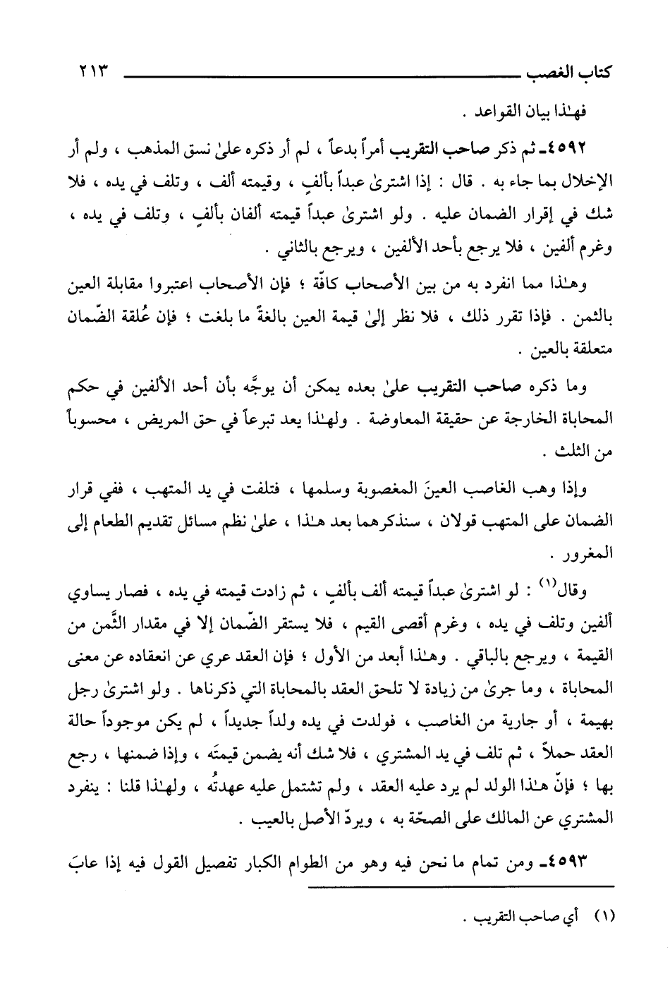 4592 - ثم ذكر صاحب التقريب أمراً بدعاً، لم أر ذكره على نسق المذهب، ولم أر الإخلال بما جاء به. قال: إذا اشترى عبداً بألفٍ، وقيمته ألف، وتلف في يده، فلا شك في إقرار الضمان عليه. ولو اشترى عبداً قيمته ألفان بألفٍ، وتلف في يده، وغرم ألفين، فلا يرجع بأحد الألفين، ويرجع بالثاني.