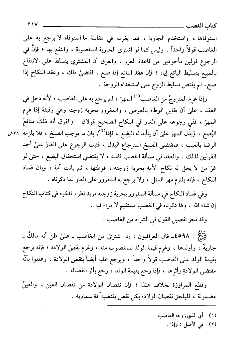 4598 - قال العراقيون: إذا اشترى من الغاصب -على ظن أنه مالكٌ- جاريةً، وأولدها، وغرِم قيمة الولد للمغصوب منه، وغرم نقصَ الولادة؛ فإنه يرجع بقيمة الولد على الغاصب قولاً واحداً، ويرجع عليه أيضاً بنقص الولادة، وعللوا بأنّه مقتضى الولادةِ وأثرِها، فإذا رجع بقيمة الولد، رجع بأثر انفصاله.
