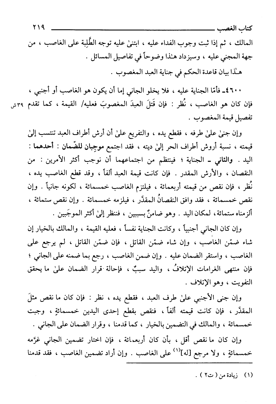 4600 - فأمّا الجناية عليه، فلا يخلو الجاني إما أن يكون هو الغاصب أو أجنبي، فإن كان هو الغاصب، نُظر: فإن قَتلَ العبدَ المغصوبَ فعليه القيمة، كما تقدم تفصيل قيمة المغصوب.