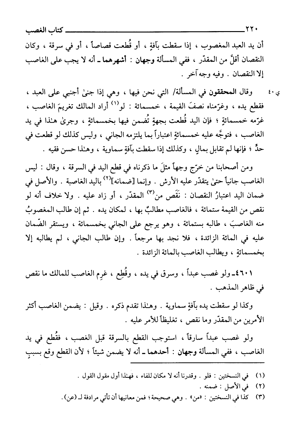 أن يد العبد المغصوب، إذا سقطت بآفةٍ، أو قُطعت قصاصاً، أو في سرقة، وكان النقصان أقلَّ من المقدّر، ففي المسألة وجهان: أشهرهما - أنه لا يجب على الغاصب إلا النقصان. وفيه وجه آخر.