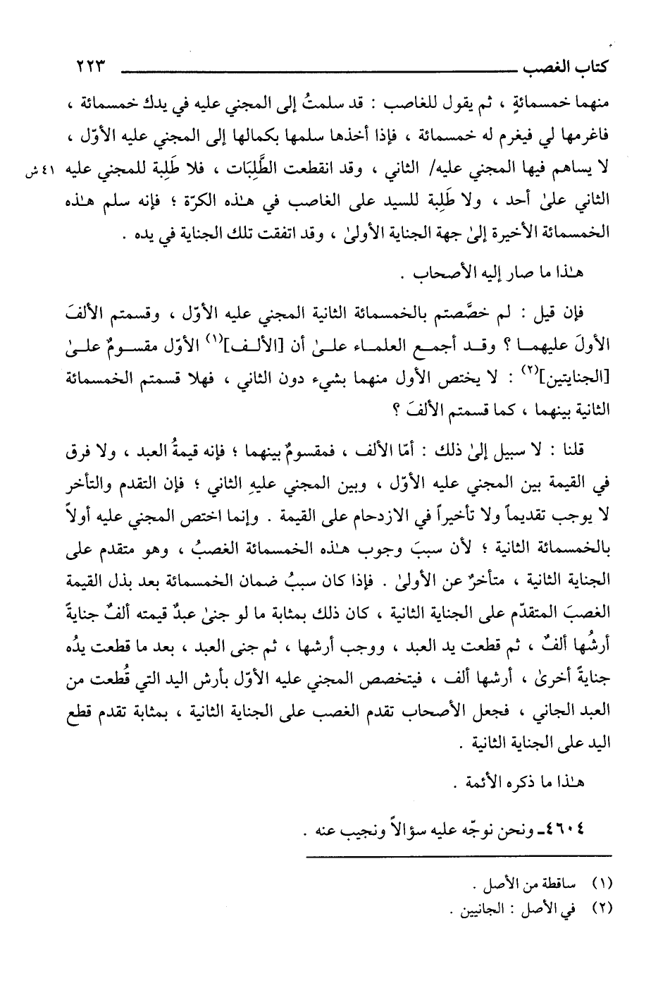 منهما خمسمائةٍ، ثم يقول للغاصب: قد سلمتُ إلى المجني عليه في يدك خمسمائة، فاغرمها لي فيغرم له خمسمائة، فإذا أخذها سلمها بكمالها إلى المجني عليه الأوّل، لا يساهم فيها المجني عليه الثاني، وقد انقطعت الطَّلِبَات، فلا طَلِبة للمجني عليه الثاني على أحد، ولا طَلِبة للسيد على الغاصب في هذه الكرّة؛ فإنه سلم هذه الخمسمائة الأخيرة إلى جهة الجناية الأولى، وقد اتفقت تلك الجناية في يده.