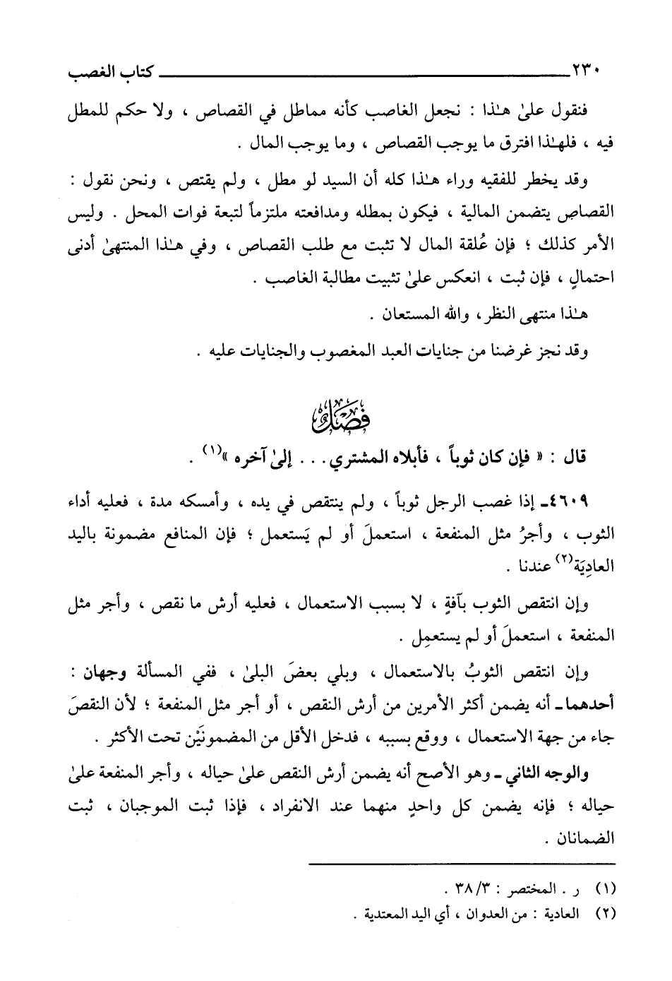 4609 - إذا غصب الرجل ثوباً، ولم ينتقص في يده، وأمسكه مدة، فعليه أداء الثوب، وأجرُ مثل المنفعة، استعملَ أو لم يَستعمل؛ فإن المنافع مضمونة باليد العادِيَة (2) عندنا.