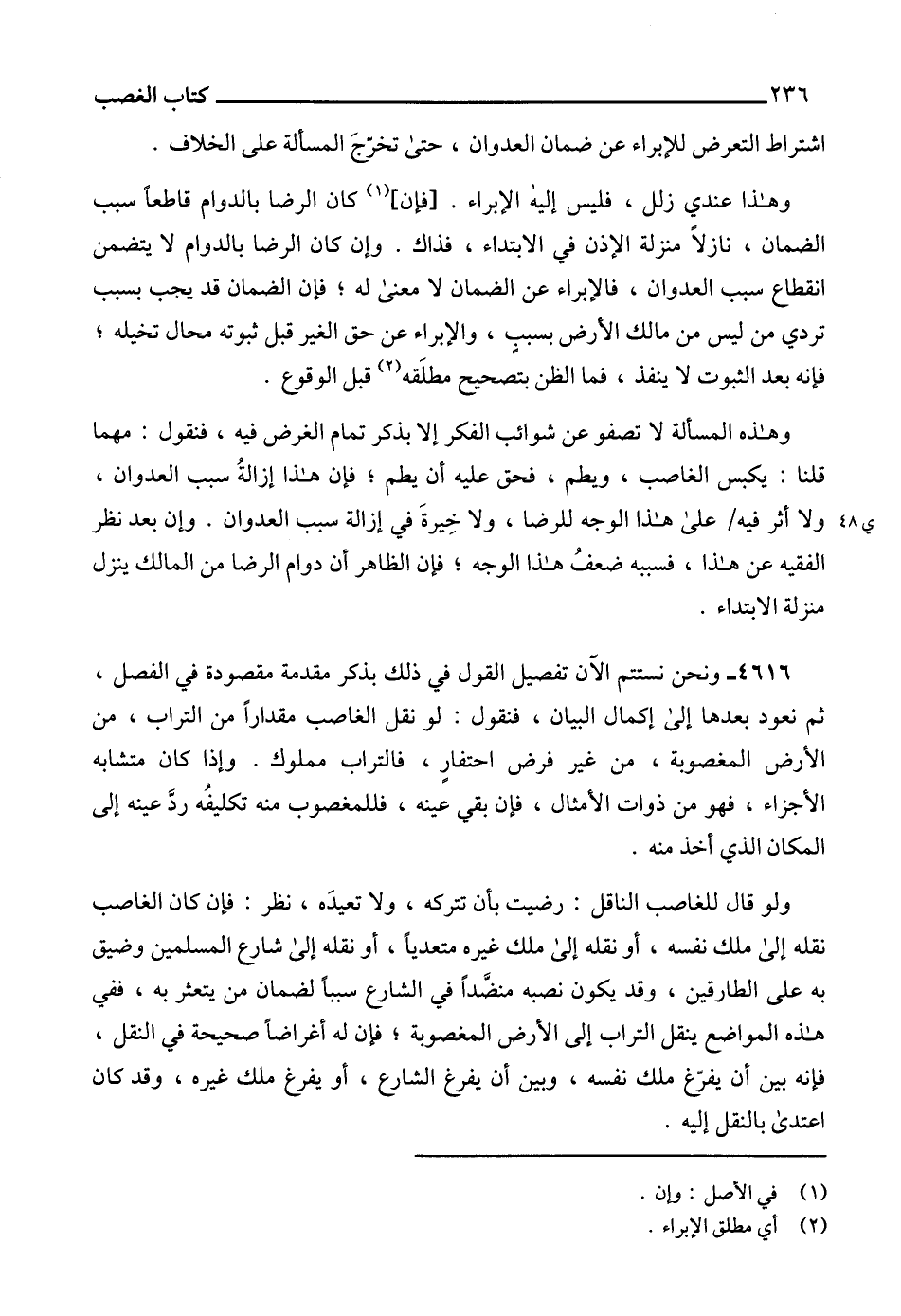 4616 - ونحن نستتم الآن تفصيل القول في ذلك بذكر مقدمة مقصودة في الفصل، ثم نعود بعدها إلى إكمال البيان، فنقول: لو نقل الغاصب مقداراً من التراب، من الأرض المغصوبة، من غير فرض احتفارٍ، فالتراب مملوك. وإذا كان متشابه الأجزاء، فهو من ذوات الأمثال، فإن بقي عينه، فللمغصوب منه تكليفُه ردَّ عينه إلى المكان الذي أخذ منه.