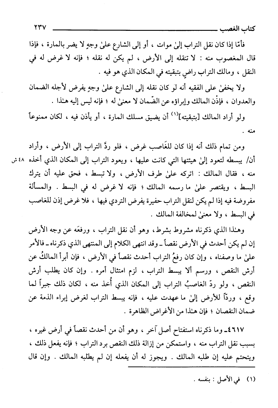 4617 - وما ذكرناه استفتاح أصل آخر، وهو أن من أحدث نقصاً في أرض غيره، بسبب نقل التراب منه، واستمكن من إزالة ذلك النقص برد التراب؛ فإنه يفعل ذلك، ويتحتم عليه إن طلبه المالك. ويجوز له أن يفعله إن لم يطلبه المالك. وإن قال