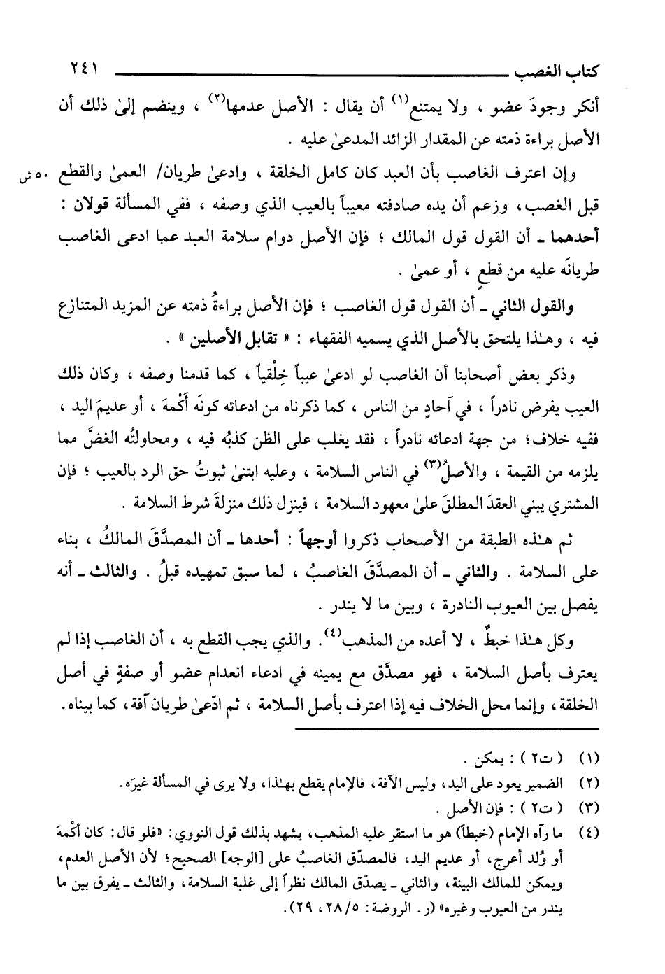 (4) ما رآه الإمام (خبطاً) هو ما استقر عليه المذهب، يشهد بذلك قول النووي: "فلو قال: كان أكْمهَ أو وُلد أعرج، أو عديم اليد، فالمصدّق الغاصبُ على [الوجه] الصحيح؛ لأن الأصل العدم، ويمكن للمالك البينة، والثاني - يصدّق المالك نظراً إلى غلبة السلامة، والثالث - يفرق بين ما يندر من العيوب وغيره" (ر. الروضة: 5/ 28، 29).