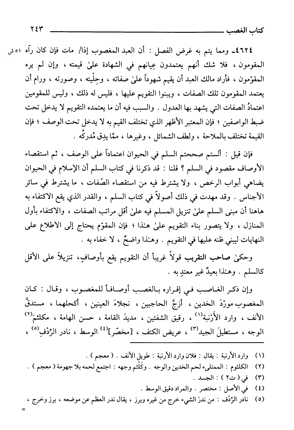 4624 - ومما يتم به غرض الفصل: أن العبد المغصوب إذا مات فإن كان رآه المقومون، فلا شك أنهم يعتمدون عِيانهم في الشهادة على قيمته، وإن لم يره المقوّمون، فأراد مالك العبد أن يقيم شهوداً على صفاته، وحِلْيته، وصورته، ورام أن يعتمد المقومون تلك الصفات، ويبنوا التقويم عليها، فليس له ذلك، وليس للمقومين اعتمادُ الصفات التي يشهد بها العدول. والسبب فيه أن ما يعتمده التقويم لا يدخل تحت ضبط الواصفين؛ فإن المعتبر الأظهر الذي تختلف القيم به لا يدخل تحت الوصف؛ فإن القيمة تختلف بالملاحة، ولطف الشمائل، وغيرها، ممَّا يدِق مُدركُه.