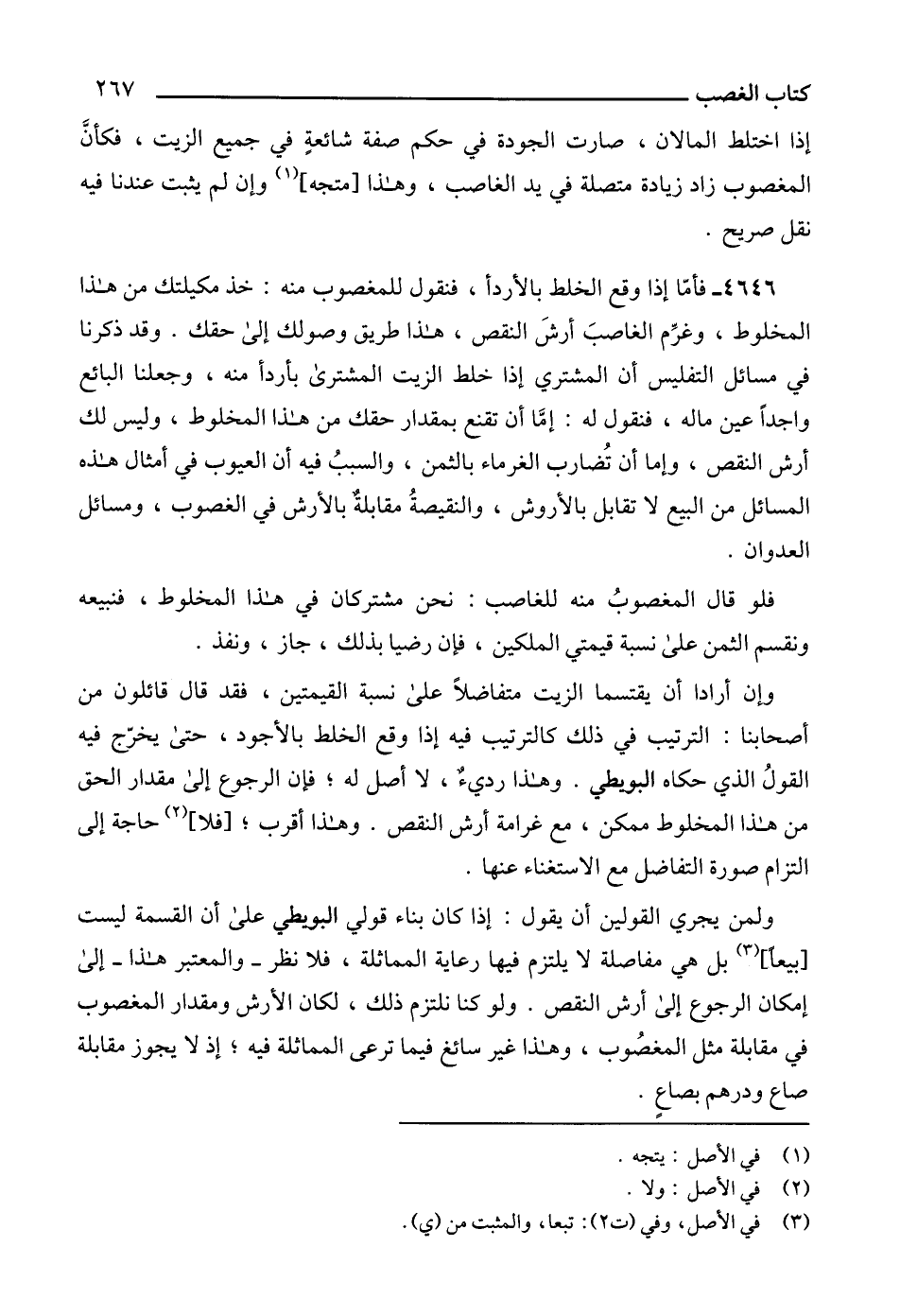 4646 - فأمّا إذا وقع الخلط بالأردأ، فنقول للمغصوب منه: خذ مكيلتك من هذا المخلوط، وغرِّم الغاصبَ أرشَ النقص، هذا طريق وصولك إلى حقك. وقد ذكرنا في مسائل التفليس أن المشتري إذا خلط الزيت المشترى بأردأ منه، وجعلنا البائع واجداً عين ماله، فنقول له: إمَّا أن تقنع بمقدار حقك من هذا المخلوط، وليس لك أرش النقص، وإما أن تُضارب الغرماء بالثمن، والسببُ فيه أن العيوب في أمثال هذه المسائل من البيع لا تقابل بالأروش، والنقيصةُ مقابلةٌ بالأرش في الغصوب، ومسائل العدوان.
