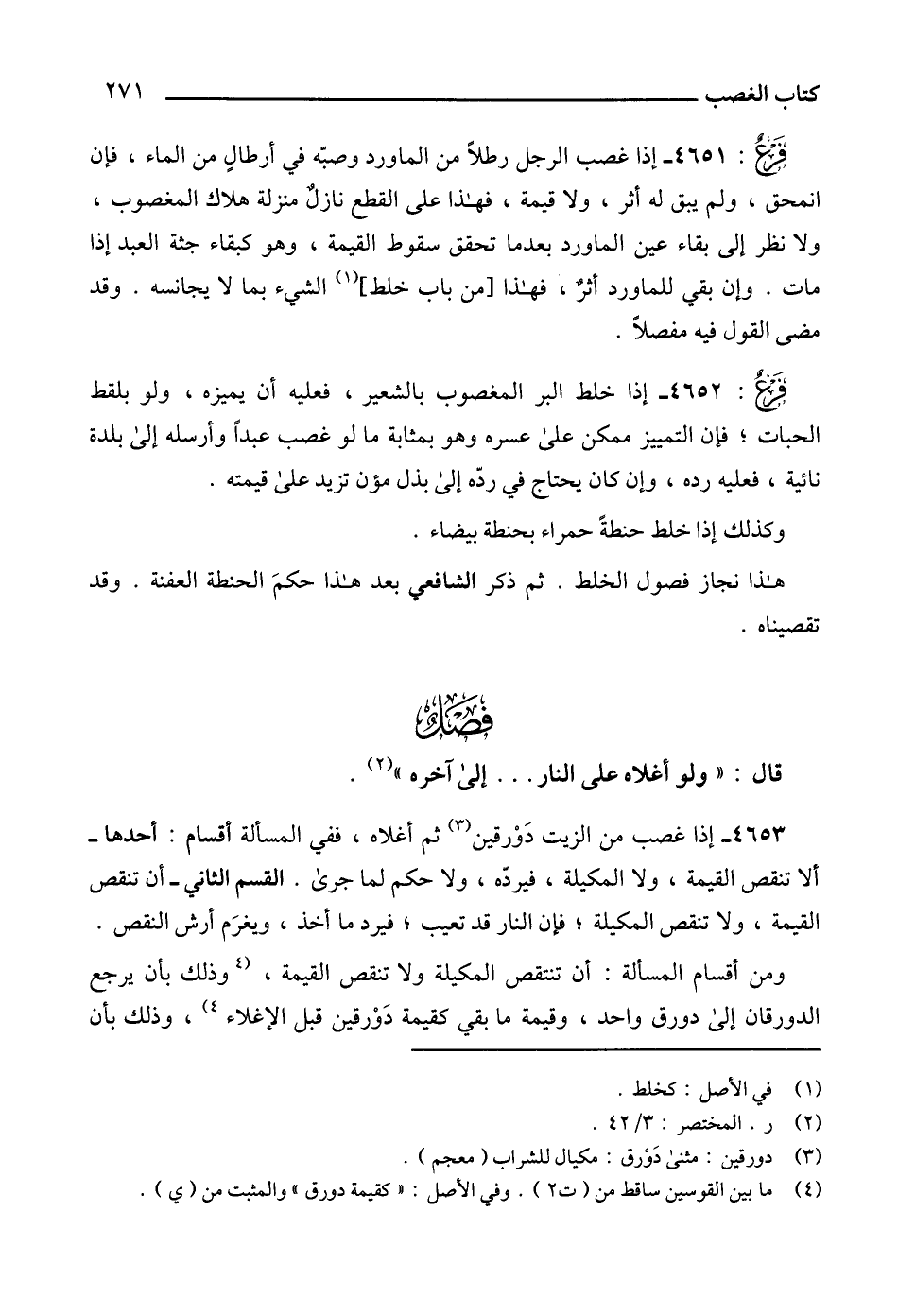 4653 - إذا غصب من الزيت دَوْرقين (3) ثم أغلاه، ففي المسألة أقسام: أحدها - ألا تنقص القيمة، ولا المكيلة، فيردّه، ولا حكم لما جرى. القسم الثاني - أن تنقص القيمة، ولا تنقص المكيلة؛ فإن النار قد تعيب؛ فيرد ما أخذ، ويغرَم أرش النقص.