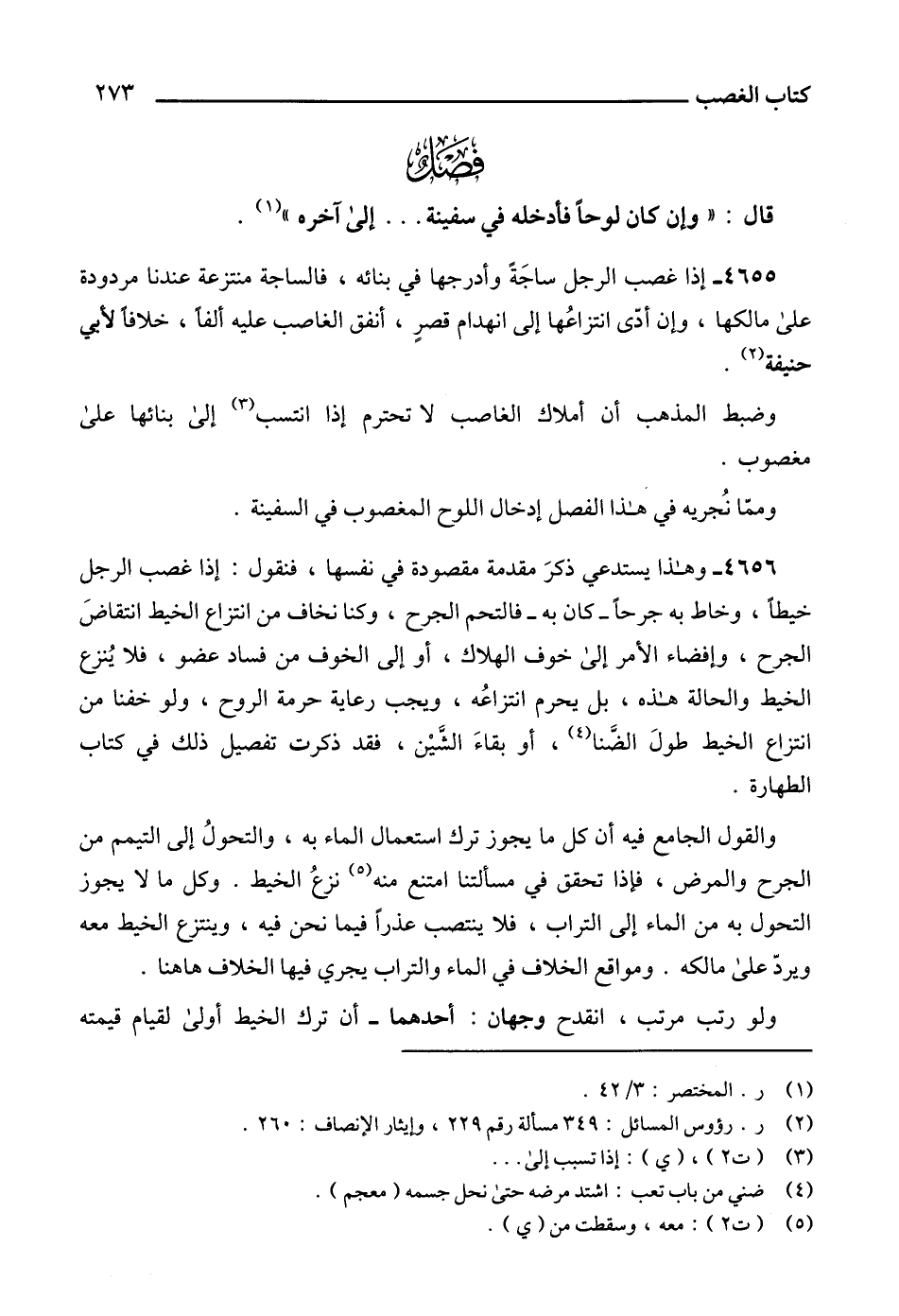 4656 - وهذا يستدعي ذكرَ مقدمة مقصودة في نفسها، فنقول: إذا غصب الرجل خيطاً، وخاط به جرحاً -كان به- فالتحم الجرح، وكنا نخاف من انتزاع الخيط انتقاضَ الجرح، وإفضاء الأمر إلى خوف الهلاك، أو إلى الخوف من فساد عضو، فلا يُنزع الخيط والحالة هذه، بل يحرم انتزاعُه، ويجب رعاية حرمة الروح، ولو خفنا من انتزاع الخيط طولَ الضَّنا (4)، أو بقاءَ الشَّيْن، فقد ذكرت تفصيل ذلك في كتاب الطهارة.
