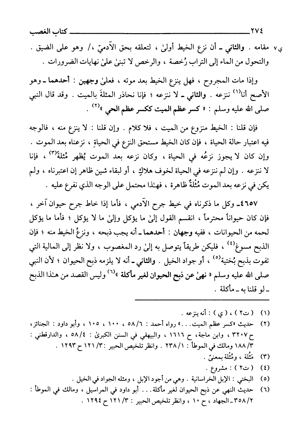 4657 - وكل ما ذكرناه في خيط جرح الآدمي، فأما إذا خاط جرح حيوان آخر، فإن كان حيواناً محترماً، انقسم القول إلى ما يؤكل وإلى ما لا يؤكل؛ فأما ما يؤكل لحمه من الحيوانات، ففيه وجهان: أحدهما - أنه يجب ذبحه، ونزعُ الخيط منه؛ فإن الذبح مسوغ (4)، فليكن طريقاً يتوصل به إلى رد المغصوب، ولا نظر إلى المالية التي تفوت بذبح بُختية (5)، أو جواد الخيل. والثاني - أنه لا يلزمه ذبح الحيوان؛ لأن النبي صلى الله عليه وسلم "نهى عن ذبح الحيوان لغير مأكلة" (6) وليس القصد من هذا الذبح -لو قلنا به- مأكلة.