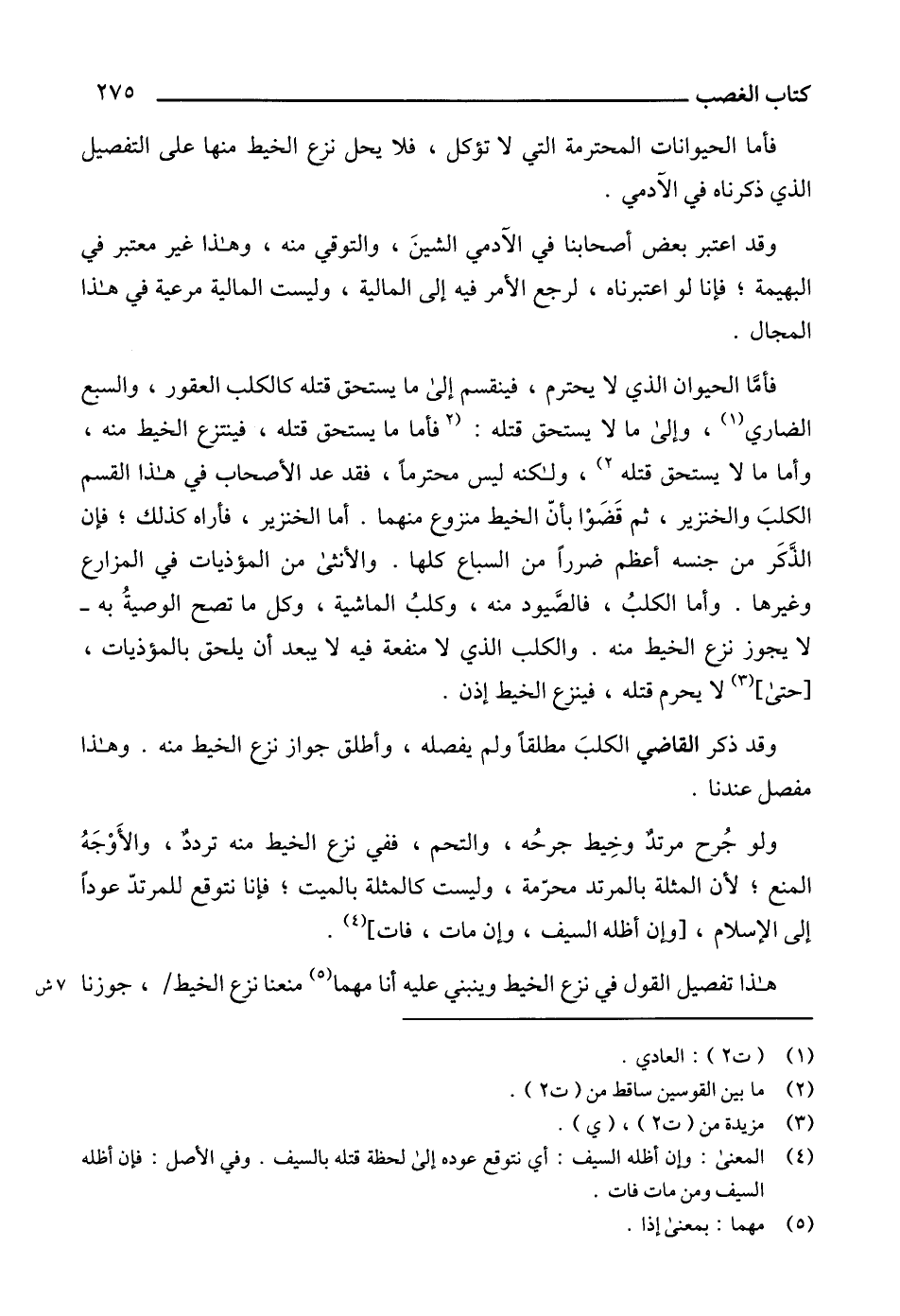 فأمَّا الحيوان الذي لا يحترم، فينقسم إلى ما يستحق قتله كالكلب العقور، والسبع الضاري (1)، وإلى ما لا يستحق قتله: (2 فأما ما يستحق قتله، فينتزع الخيط منه، وأما ما لا يستحق قتله 2)، ولكنه ليس محترماً، فقد عد الأصحاب في هذا القسم الكلبَ والخنزير، ثم قَضَوْا بأنّ الخيط منزوع منهما. أما الخنزير، فأراه كذلك؛ فإن الذَّكَر من جنسه أعظم ضرراً من السباع كلها. والأنثى من المؤذيات في المزارع وغيرها. وأما الكلبُ، فالصَّيود منه، وكلبُ الماشية، وكل ما تصح الوصيةُ به - لا يجوز نزع الخيط منه. والكلب الذي لا منفعة فيه لا يبعد أن يلحق بالمؤذيات، [حتى] (3) لا يحرم قتله، فينزع الخيط إذن.