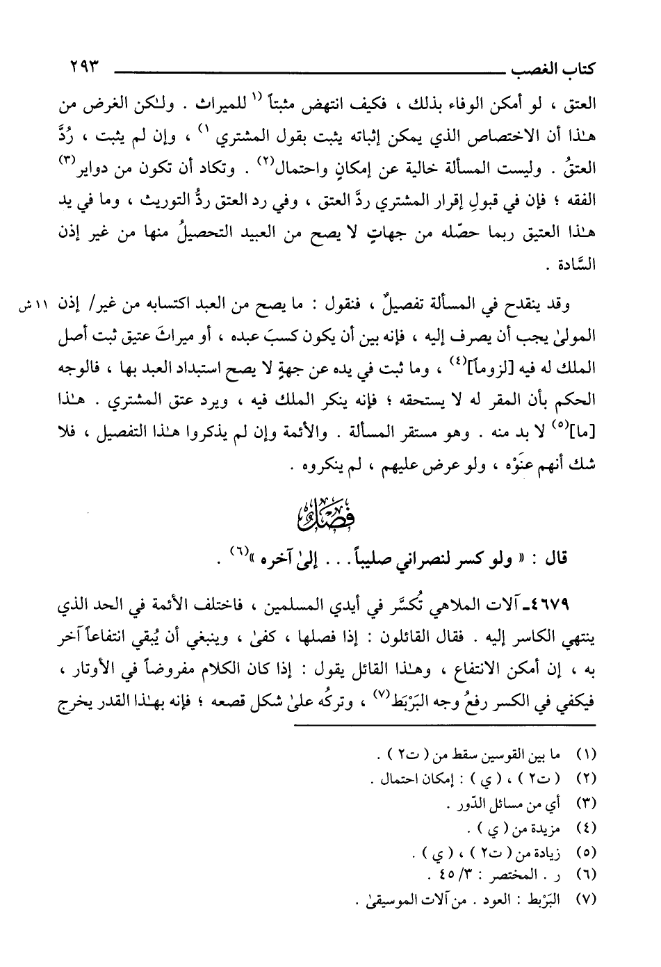 ينتهي الكاسر إليه. فقال القائلون: إذا فصلها، كفى، وينبغي أن يُبقي انتفاعاً آخر به، إن أمكن الانتفاع، وهذا القائل يقول: إذا كان الكلام مفروضاً في الأوتار، فيكفي في الكسر رفعُ وجه البَرْبَط (7)، وتركُه على شكل قصعه؛ فإنه بهذا القدر يخرج