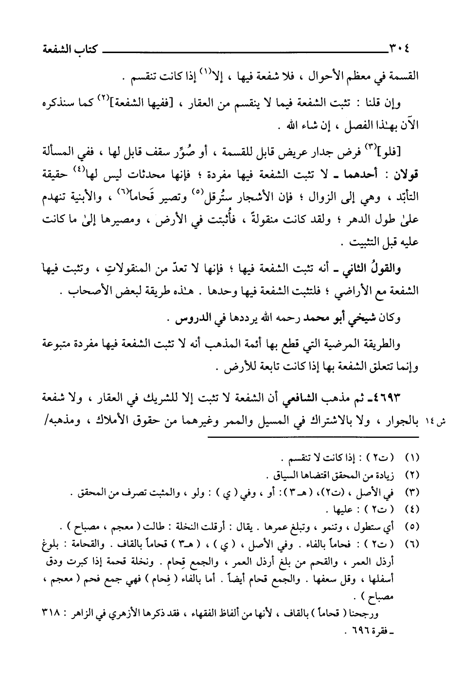 4693 - ثم مذهب الشافعي أن الشفعة لا تثبت إلا للشريك في العقار، ولا شفعة بالجوار، ولا بالاشتراك في المسيل والممر وغيرهما من حقوق الأملاك، ومذهبه