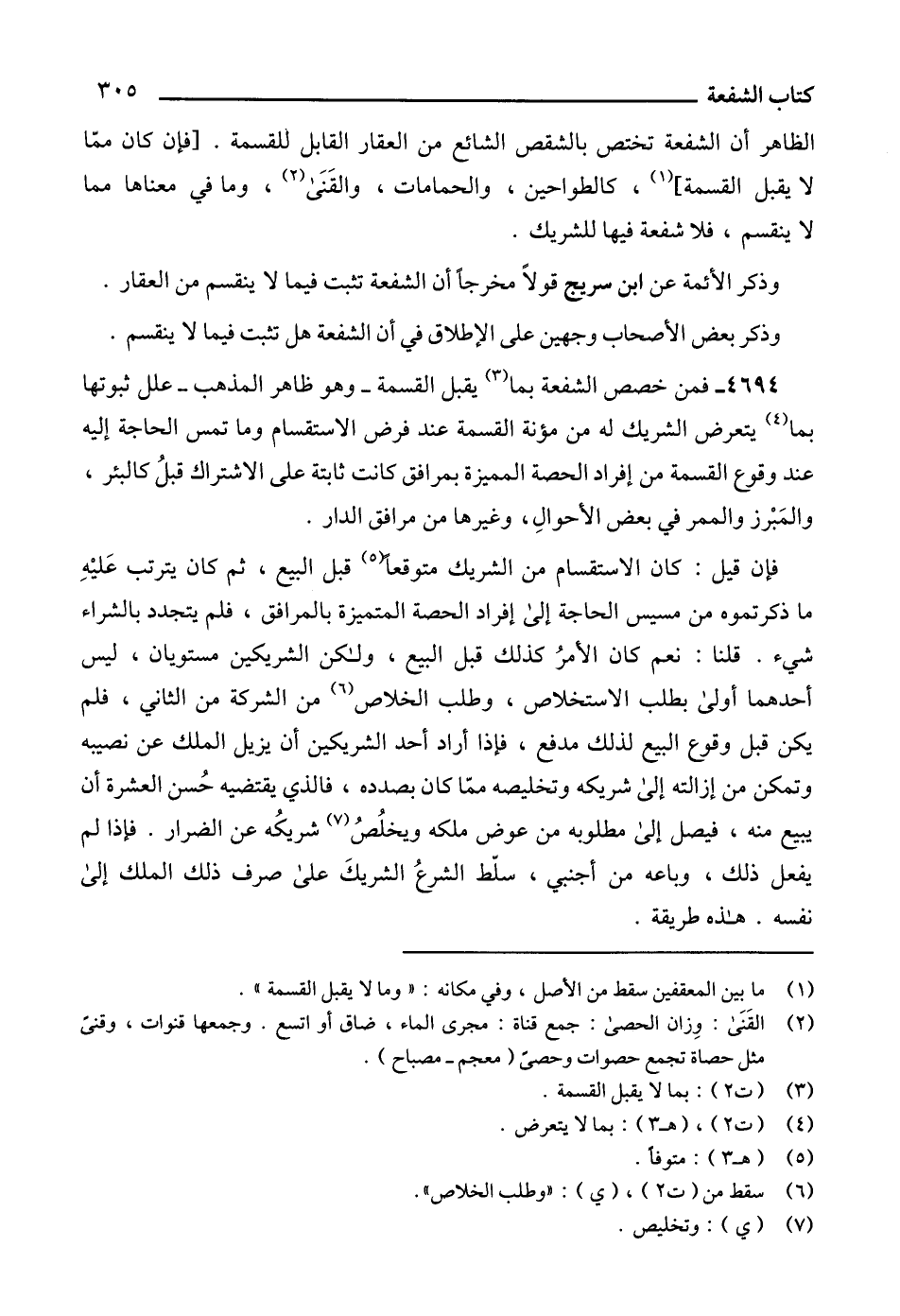 4694 - فمن خصص الشفعة بما (3) يقبل القسمة -وهو ظاهر المذهب- علل ثبوتها بما (4) يتعرض الشريك له من مؤنة القسمة عند فرض الاستقسام وما تمس الحاجة إليه عند وقوع القسمة من إفراد الحصة المميزة بمرافق كانت ثابتة على الاشتراك قبلُ كالبئر، والمَبْرز والممر في بعض الأحوالِ، وغيرها من مرافق الدار.