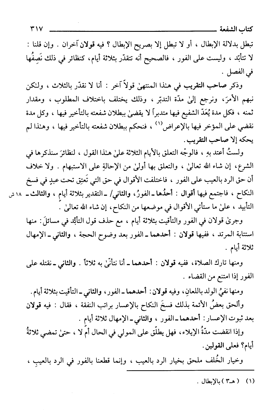 وذكر صاحب التقريب في هذا المنتهى قولاً آخر: أنا لا نقدّر بالثلاث، ولكن نبهم الأمرَ، ونرجع إلى مدّة التدبّر، وذلك يختلف باختلاف المطلوب، ومقدار ثمنه، فكل مدة يُعَدّ الشفيع فيها متدبراً لا يقضى ببطلان شفعته بالتأخير فيها، وكل مدة نقضي على المؤخر فيها بالإعراض (1)، فنحكم ببطلان شفعته بالتأخير فيها، وهذا لم يحكه إلا صاحب التقريب.