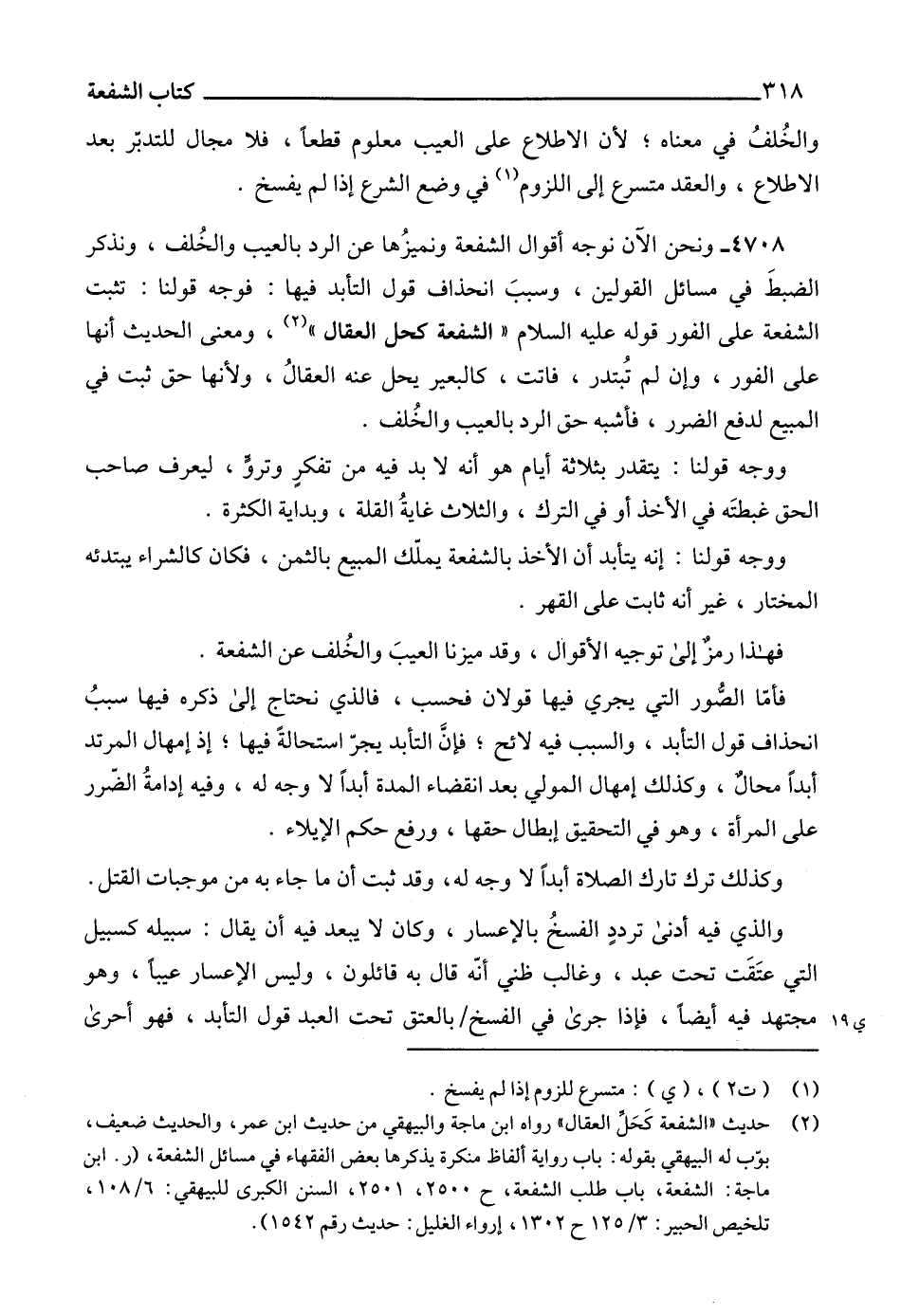4708 - ونحن الآن نوجه أقوال الشفعة ونميزُها عن الرد بالعيب والخُلف، ونذكر الضبطَ في مسائل القولين، وسببَ انحذاف قول التأبد فيها: فوجه قولنا: تثبت الشفعة على الفور قوله عليه السلام "الشفعة كحل العقال" (2)، ومعنى الحديث أنها على الفور، وإن لم تُبتدر، فاتت، كالبعير يحل عنه العقالُ، ولأنها حق ثبت في المبيع لدفع الضرر، فأشبه حق الرد بالعيب والخُلف.