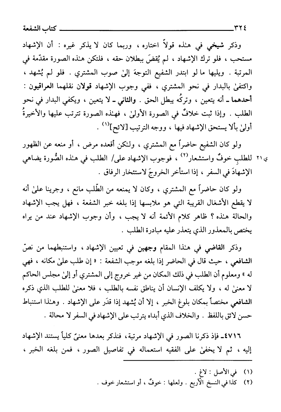 ولو كان الشفيع حاضراً مع المشتري، ولكن أقعده مرض، أو منعه عن الظهور للطلبِ خوفٌ واستشعار (2)، فوجوب الإشهاد على الطلب في هذه الصُّورة يضاهي الإشهادَ في السفر، إذا استأخر الخروجَ لاستئخار الرفاق.