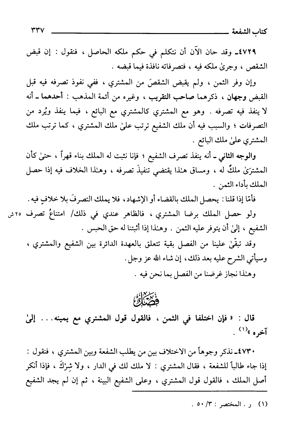 4729 - وقد حان الآن أن نتكلم في حكم ملكه الحاصل، فنقول: إن قبض الشقص، وجرى ملكه فيه، فتصرفاته نافذة فيما قبضه.