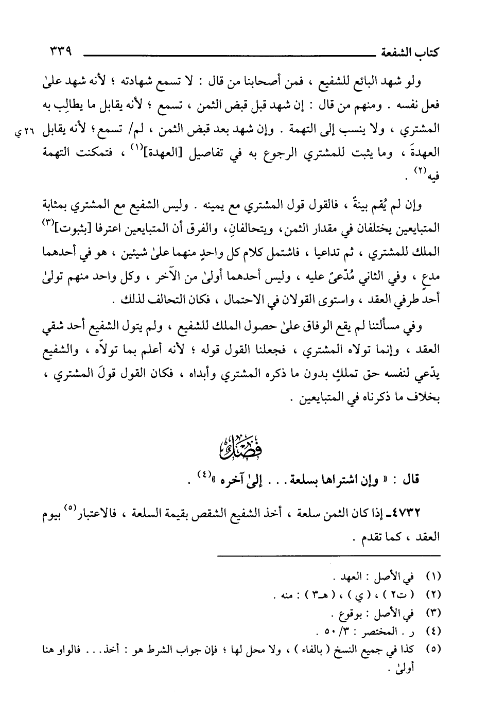 4732 - إذا كان الثمن سلعة، أخذ الشفيع الشقص بقيمة السلعة، فالاعتبار (5) بيوم العقد، كما تقدم.