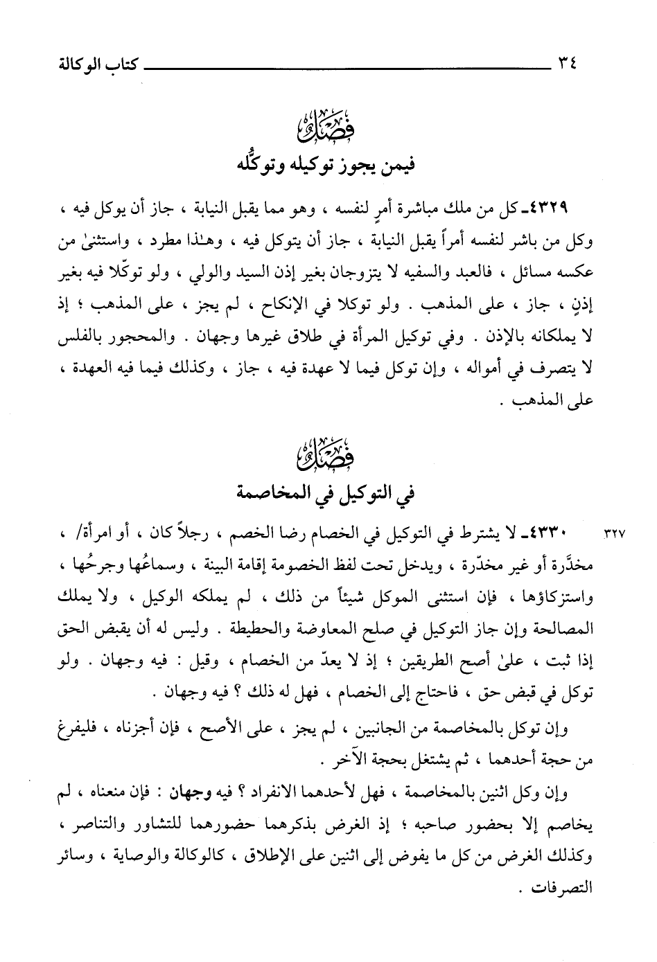 4329 - كل من ملك مباشرة أمرٍ لنفسه، وهو مما يقبل النيابة، جاز أن يوكل فيه، وكل من باشر لنفسه أمراً يقبل النيابة، جاز أن يتوكل فيه، وهذا مطرد، واستثنى من عكسه مسائل، فالعبد والسفيه لا يتزوجان بغير إذن السيد والولي، ولو توكّلا فيه بغير إذنٍ، جاز، على المذهب. ولو توكلا في الإنكاح، لم يجز، على المذهب؛ إذ لا يملكانه بالإذن. وفي توكيل المرأة في طلاق غيرها وجهان. والمحجور بالفلس لا يتصرف في أمواله، وإن توكل فيما لا عهدة فيه، جاز، وكذلك فيما فيه العهدة، على المذهب.