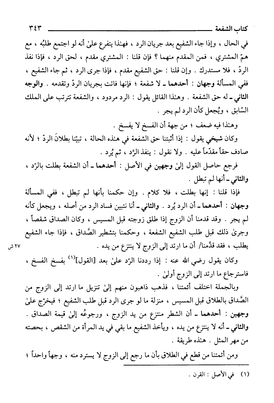 فرجع حاصل القول إلى وجهين في الأصل: أحدهما - أن الشفعة بطلت بالرّد، والثاني - أنها لم تبطل.