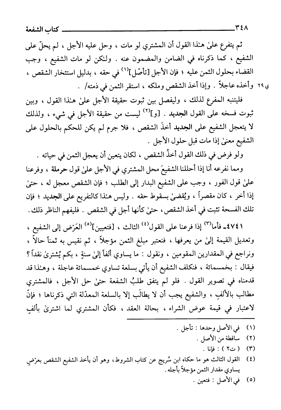 فليتنبه المفرع لذلك، وليفصل بين ثبوت حقيقة الأجل على هذا القول، وبين ثبوت فسخه على القول الجديد. [و] (2) ليست من حقيقة الأجل في شيء، ولذلك لا يتعجل الشفيع على الجديد أخذَ الشقص، فلا جرم لم يكن للحكم بالحلول على الشفيع معنى إذا مات قبل حلول الأجل.