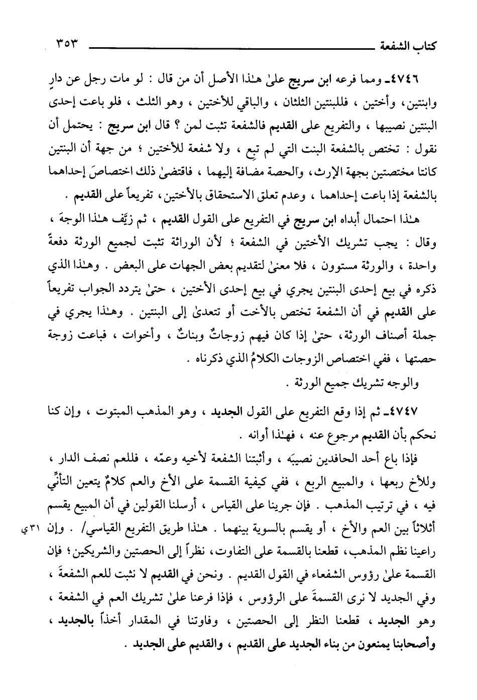 4747 - ثم إذا وقع التفريع على القول الجديد، وهو المذهب المبتوت، وإن كنا نحكم بأن القديم مرجوع عنه، فهذا أوانه.