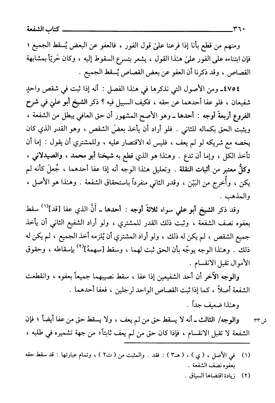 وقد ذكر الشيخ أبو علي سواه ثلاثةَ أوجه: أحدها - أَنَّ الذي عفا [قد] (1) سقط بعفوه نصف الشفعة، وثبت ذلك القدر للمشتري، ولو أراد الشفيع الثاني أن يأخذ جميع الشقص، لم يكن له ذلك، ولو أراد المشتري أن يُلزمه أخذ الجميع، لم يكن له ذلك. وهذا الوجه يوجّه بأن الحق ثبت لهما، وسقط [سهمهُ] (2) بإسقاطه، وحقوق الأموال تقبل الانقسام.