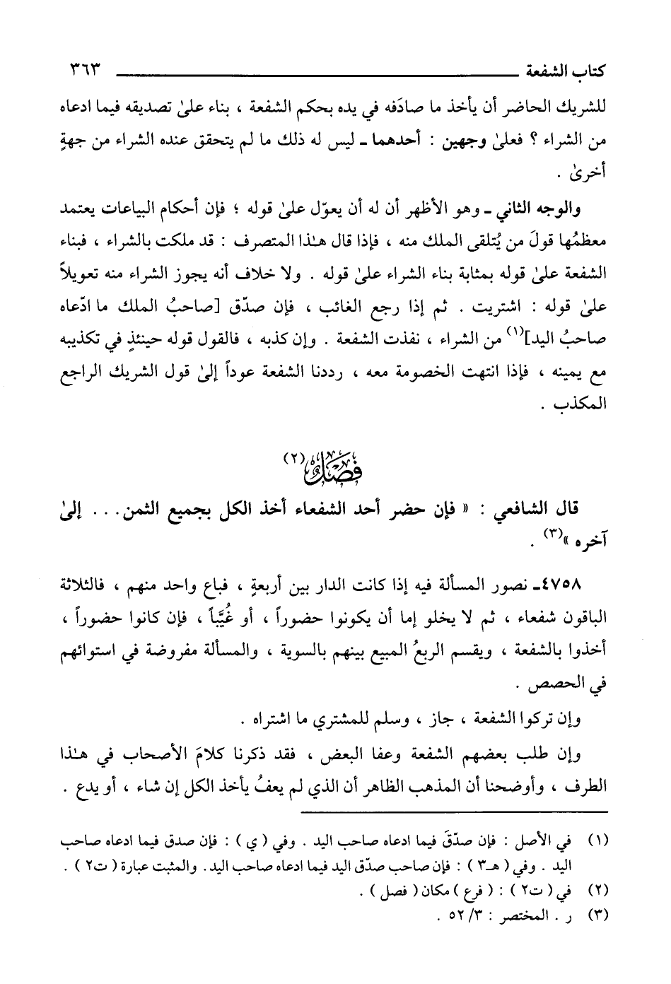 4758 - نصور المسألة فيه إذا كانت الدار بين أربعةٍ، فباع واحد منهم، فالثلاثة الباقون شفعاء، ثم لا يخلو إما أن يكونوا حضوراً، أو غُيَّباً، فإن كانوا حضوراً، أخذوا بالشفعة، ويقسم الربعُ المبيع بينهم بالسوية، والمسألة مفروضة في استوائهم في الحصص.
