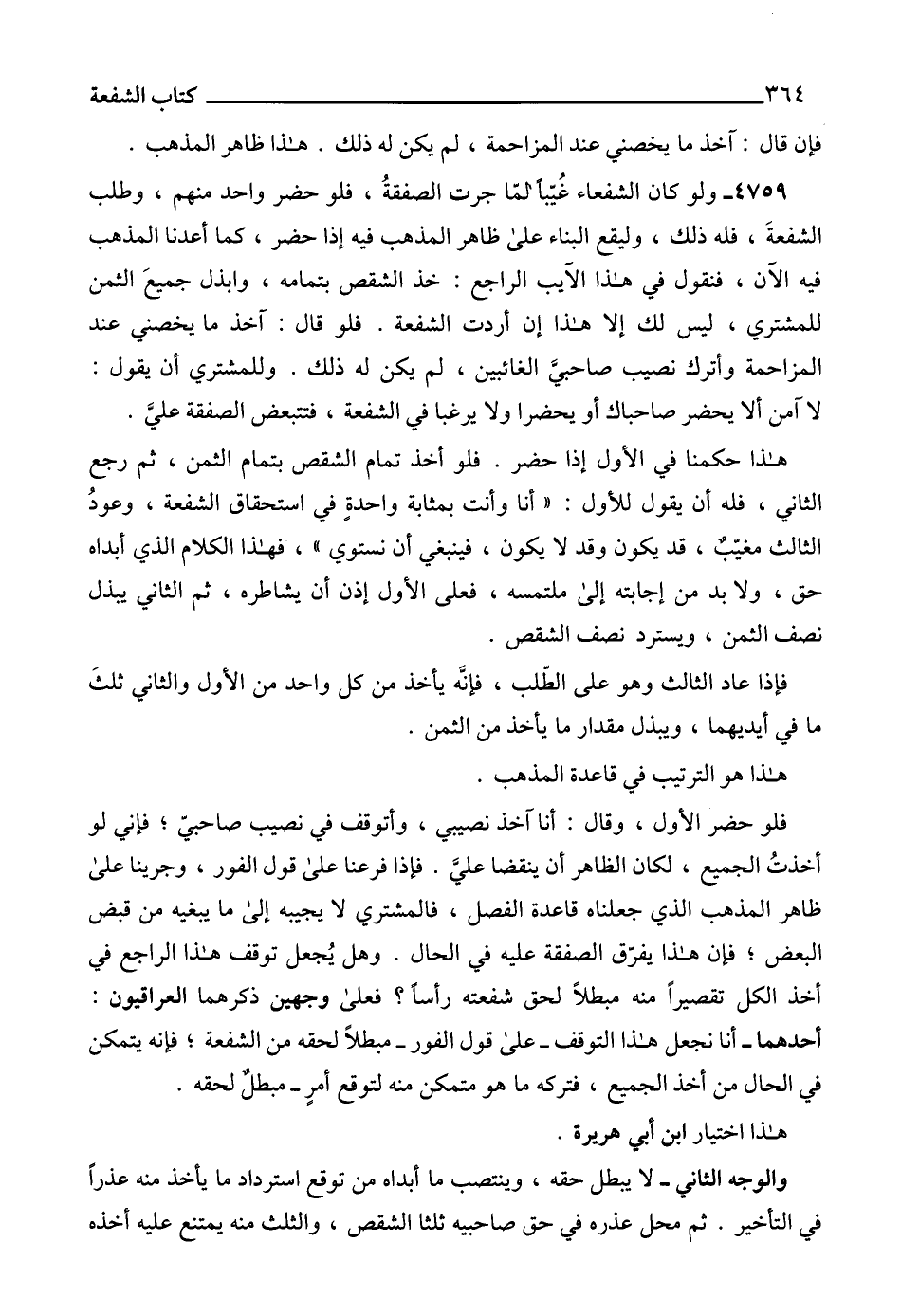 4759 - ولو كان الشفعاء غُيّباً لمّا جرت الصفقةُ، فلو حضر واحد منهم، وطلب الشفعةَ، فله ذلك، وليقع البناء على ظاهر المذهب فيه إذا حضر، كما أعدنا المذهب فيه الآن، فنقول في هذا الآيب الراجع: خذ الشقص بتمامه، وابذل جميعَ الثمن للمشتري، ليس لك إلا هذا إن أردت الشفعة. فلو قال: آخذ ما يخصني عند المزاحمة وأترك نصيب صاحبيَّ الغائبين، لم يكن له ذلك. وللمشتري أن يقول: لا آمن ألا يحضر صاحباك أو يحضرا ولا يرغبا في الشفعة، فتتبعض الصفقة عليَّ.