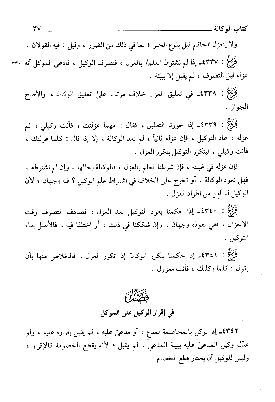 4342 - إذا توكل بالمخاصمة لمدعٍ، أو مدعىً عليه، لم يقبل إقراره عليه، ولو عدّل وكيل المدعى عليه ببينة المدعي، لم يقبل؛ لأنه يقطع الخصومة كالإقرار، وليس للوكيل أن يختار قطع الخصام.