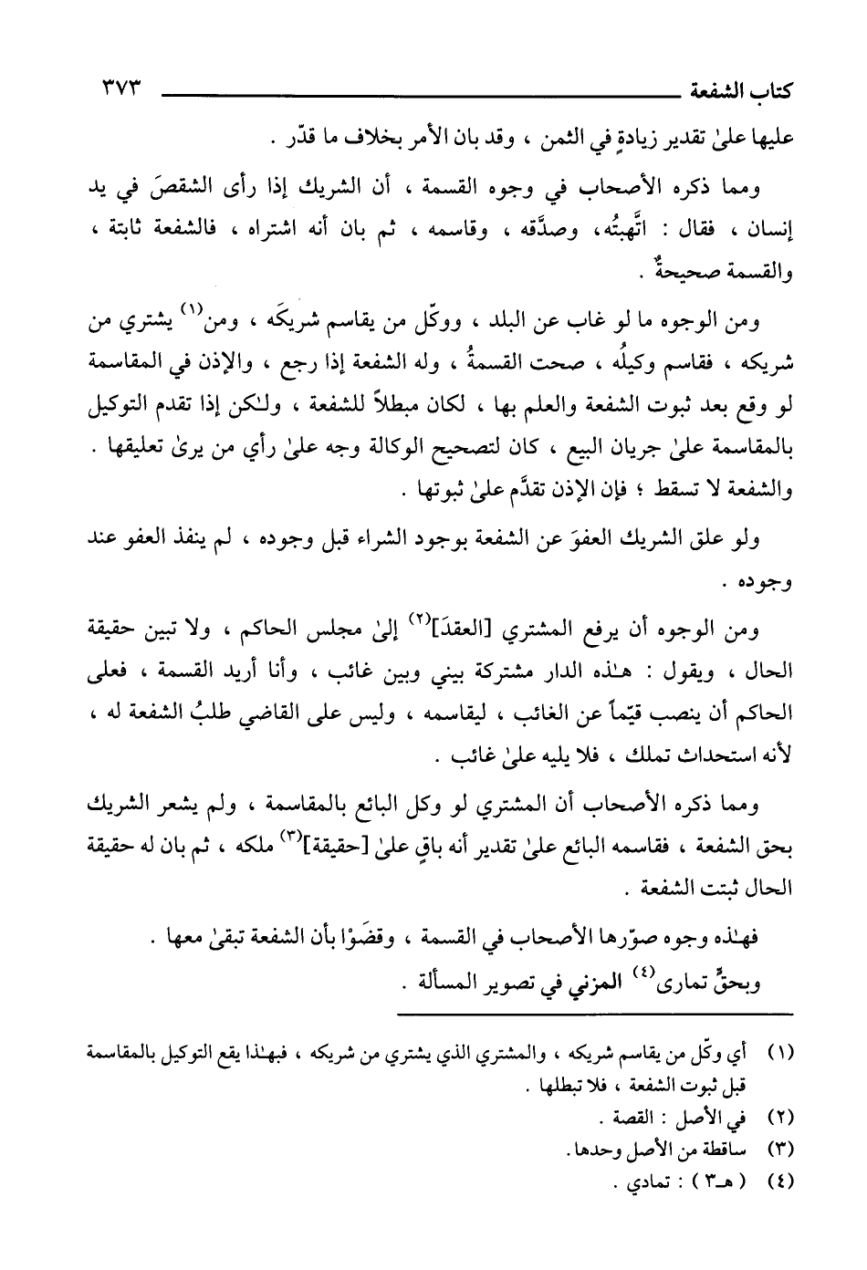 (1) أي وكّل من يقاسم شريكه، والمشري الذي يشتري من شريكه، فبهذا يقع التوكيل بالمقاسمة قبل ثبوت الشفعة، فلا تبطلها.