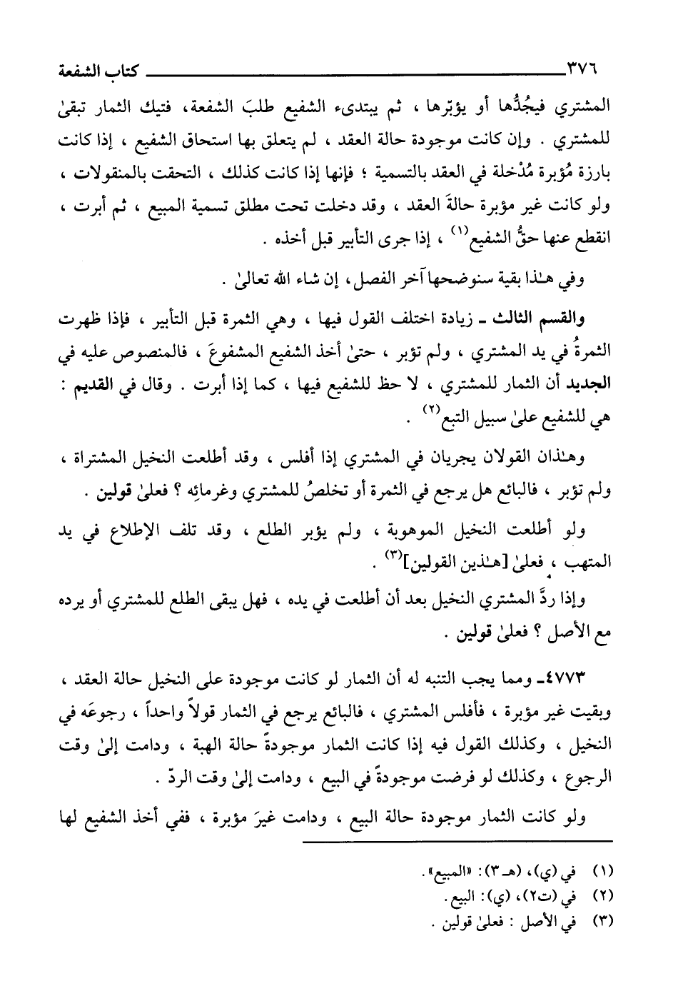 والقسم الثالث - زيادة اختلف القول فيها، وهي الثمرة قبل التأبير، فإذا ظهرت الثمرةُ في يد المشتري، ولم تؤبر، حتى أخذ الشفيع المشفوعَ، فالمنصوص عليه في الجديد أن الثمار للمشتري، لا حظ للشفيع فيها، كما إذا أبرت. وقال في القديم: هي للشفيع على سبيل التبع (2).