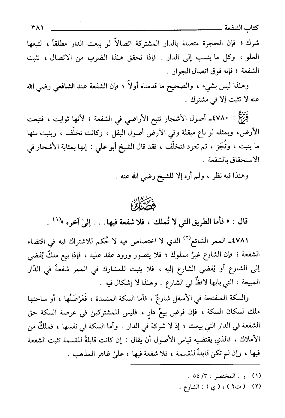 4781 - الممر الشائع (2) الذي لا اختصاص فيه لا حُكم للاشتراك فيه في اقتضاء الشفعة؛ فإن الشارع غيرُ مملوك؛ فلا يتصور ورود عقد عليه، فإذا بيع ملكٌ يُفضي إلى الشارع أو يُفضي الشارع إليه، فلا يثبت للمشارك في الممر شفعةٌ في الدّار المبيعة، التي بابها لافظٌ في الشارع. وهذا لا إشكال فيه.