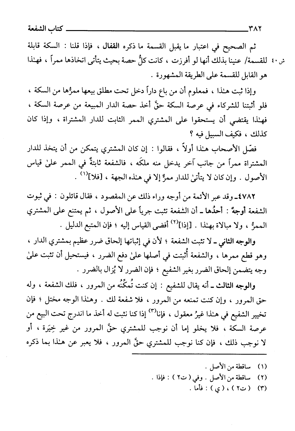 4782 - وقد عبر الأئمة من أوجه وراء ذلك عن المقصود، فقال قائلون: في ثبوت الشفعة أوجهٌ: أحدُها- أن الشفعة تثبت جرياً على الأصول، ثم يمتنع على المشتري الممرُّ، ولا مبالاة بهذا. [إذا] (2) أفضى القياس إليه؛ فإن المتبع الدليل.