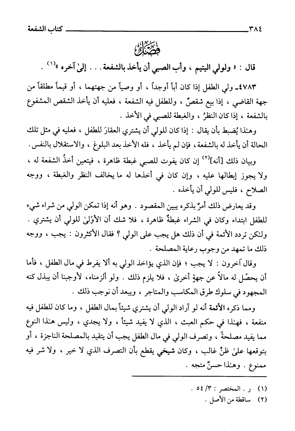 4783 - ولي الطفل إذا كان أباً أوجداً، أو وصياً من جهتهما، أو قيماً مطلقاً من جهة القاضي، إذا بيع شقصٌ، وللطفل فيه الشفعة، فعليه أن يأخذ الشقص المشفوع بالشفعة، إذا كان النظرُ، والغبطة للصبي في الأخذ.