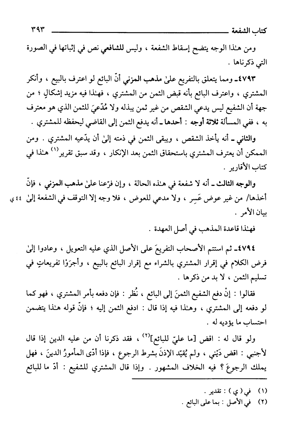 والثانن- أنه يأخذ الشقص، ويبقى الثمن في ذمته إلى أن يدّعيه المشتري. ومن الممكن أن يعترف المشتري باستحقاق الثمن بعد الإنكار، وقد سبق تقرير (1) هذا في كتاب الأقارير.