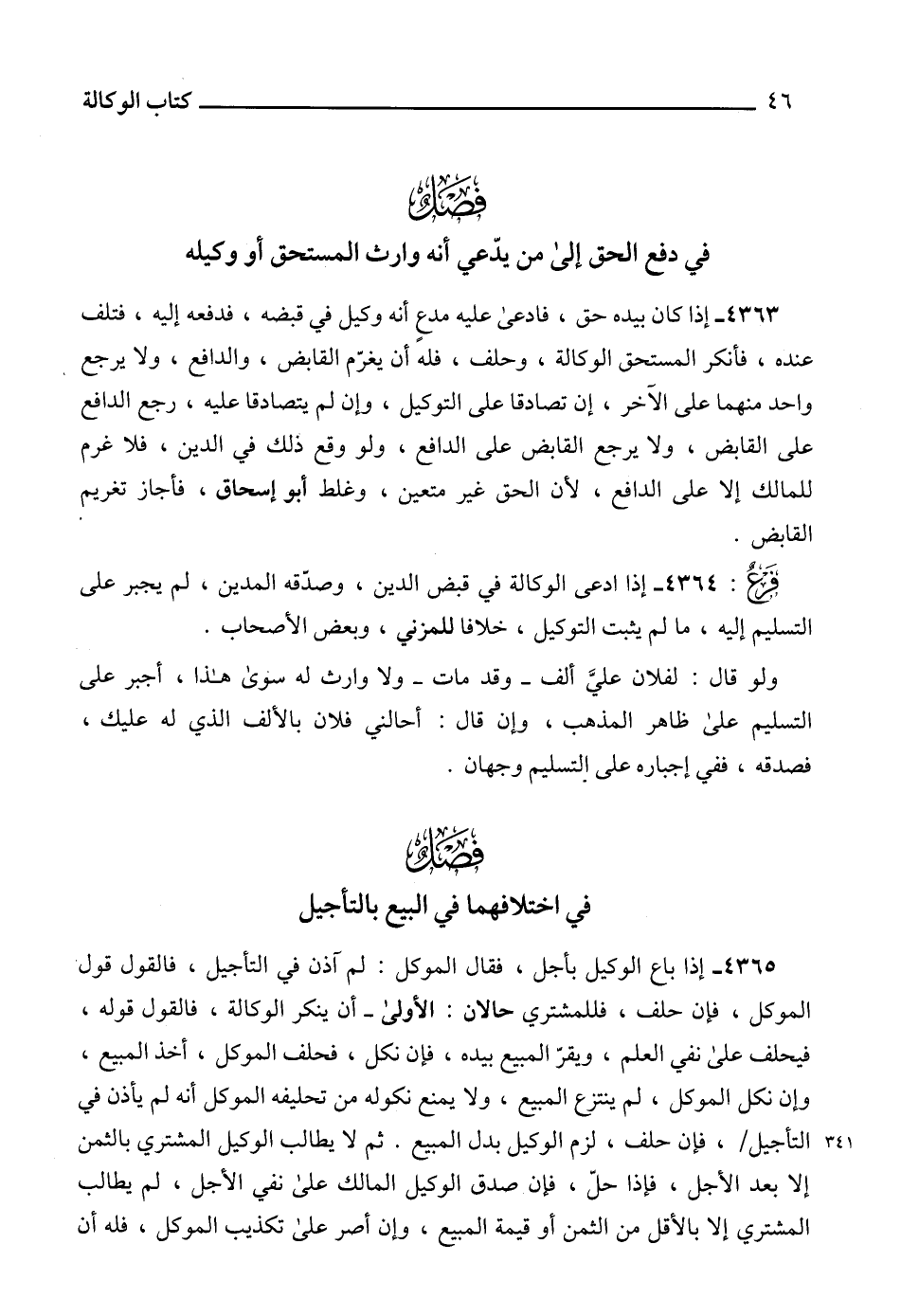 4365 - إذا باع الوكيل بأجل، فقال الموكل: لم آذن في التأجيل، فالقول قول الموكل، فإن حلف، فللمشتري حالان: الأولى - أن ينكر الوكالة، فالقول قوله، فيحلف على نفي العلم، ويقرّ المبيع بيده، فإن نكل، فحلف الموكل، أخذ المبيع، وإن نكل الموكل، لم ينتزع المبيع، ولا يمنع نكوله من تحليفه الموكل أنه لم يأذن في التأجيل، فإن حلف، لزم الوكيل بدل المبيع. ثم لا يطالب الوكيل المشتري بالثمن إلا بعد الأجل، فإذا حلّ، فإن صدق الوكيل المالك على نفي الأجل، لم يطالب المشتري إلا بالأقل من الثمن أو قيمة المبيع، وإن أصر على تكذيب الموكل، فله أن